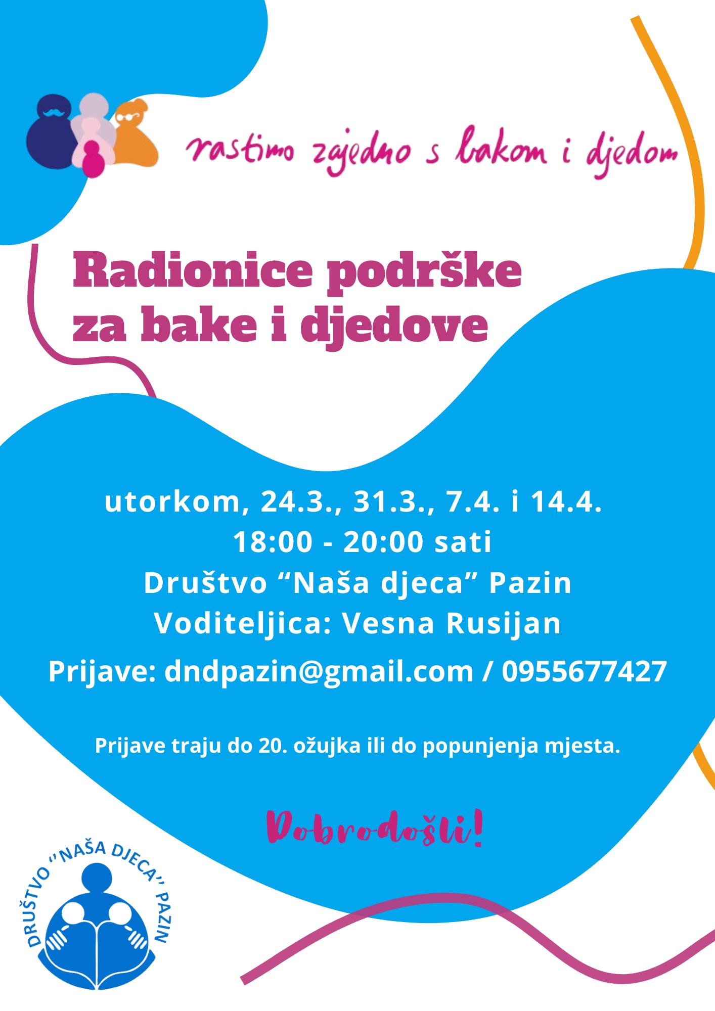 pozivamo Vas da nam se pridružite na besplatnim radionicama “Rastimo zajedno s bakom i djedom” koje se od ovoga ožujka po prvi puta provode u DND-u Pazin!